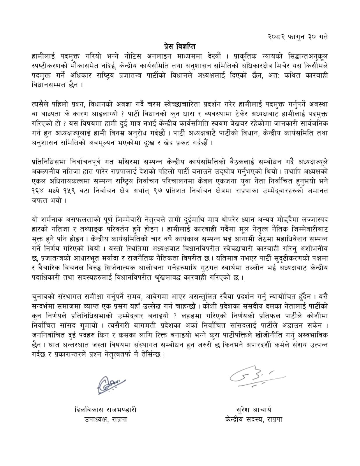 राप्रपामा कारबाही विवाद : पदमुक्त पत्रपछि उपाध्यक्ष राजभण्डारी र केन्द्रीय सदस्य आचार्यको प्रेस विज्ञप्ति सार्वजनिक
